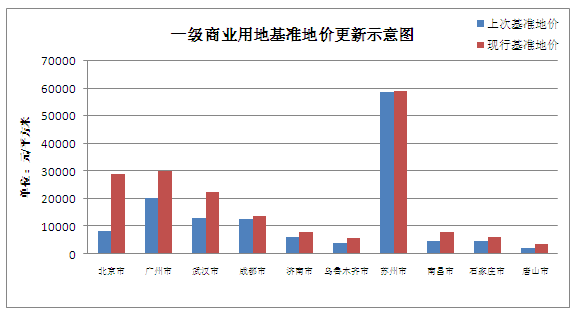 從近年城市基準地價(jià)的更新情況看,經(jīng)濟發(fā)達地區的地價(jià)總體調整幅度較大,如廣州中心城區的現行基準地價(jià)為2011年12月發(fā)布,一級商業(yè)、居住、工業(yè)用地基準地價(jià)分別為29991元/平方米、9181元/平方米、1419元/平方米,相較2010年發(fā)布地價(jià)上調幅度為46.87%、66.14%和5.82%;而烏魯木齊市現在執行的是2013年12月發(fā)布的地價(jià),距上一次基準地價(jià)的發(fā)布相距10年,與上一版基準地價(jià)相比,一級商業(yè)、住宅、工業(yè)基準地價(jià)分別上調45%、58.33%、56.72%;南昌市現行基準地價(jià)為2011年1月發(fā)布,與之前的2001年版本相比,一級商業(yè)、住宅、工業(yè)基準地價(jià)分別上調了68.86%、87.13%、27.45%。由此可見(jiàn),雖然廣州市兩次地價(jià)發(fā)布僅相距1年,但調整幅度與烏魯木齊市、南昌市10年的調整幅度差不多,城市的發(fā)達程度,土地供需差異程度對于基準地價(jià)變化幅度,尤其是對商業(yè)用地、住宅用地的更新幅度有一定的影響。